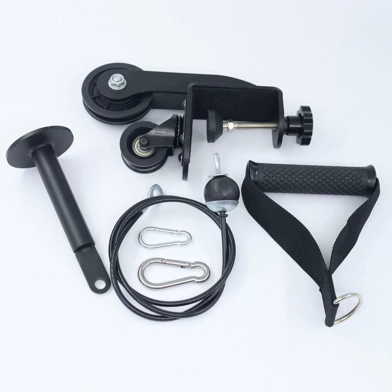 アームレスリング台だけでなく、さまざまな場所に工夫次第で取り付け可能で、一般的なケーブルトレーニングにも対応しています。パワーラックなどの支柱に取り付けてケーブルマシンとして使用することも可能です。